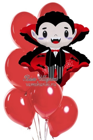 Яркий и дерзкий букет из шаров с вампиром - Графом Дракулой для стилизации вечеринки в честь Хеллуина. Состав фонтана: