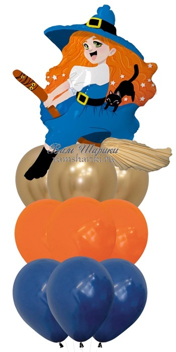 Добрый набор шаров для стилизации вечеринки в честь Хеллуина с милой ведьмочкой на метле, которая не напугает деток. Состав фонтана: