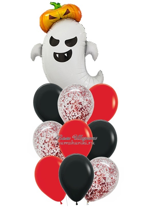 Достаточно зловещий фонтан из шаров, для тех, кому нужно оформить Хеллуин макисмально "страшно". Состав букета: