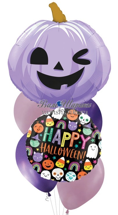 Небольшой фонтан из гелиевых шаров в стиле Хэллоуина с лавандовой тыквой. Состав фонтана: