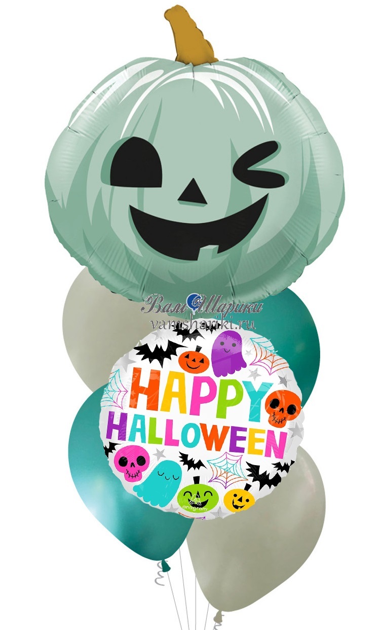 Небольшой фонтан из гелиевых шаров в стиле Хэллоуина с мятной тыквой. Состав фонтана:
