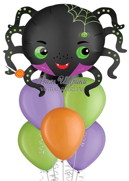 Небольшой фонтан из гелиевых шаров в стиле Хэллоуина с пауком в зеленой паутинке и леденцом. Состав фонтана: