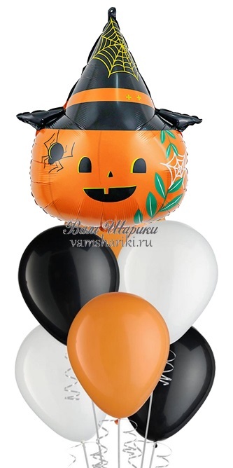 Небольшой фонтан из гелиевых шаров в стиле Хэллоуина с тыквой в черной шляпе. Состав фонтана: