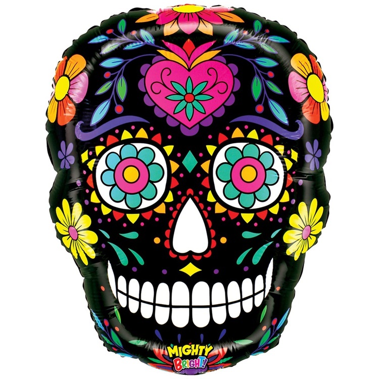 Фигурный шар из фольги с гелием в виде черного черепа с орнаментом в стиле Дня Мёртвых - станет крутым оформлением на Хэллоуин. Размер фигуры в ненаполненном виде 56 см.