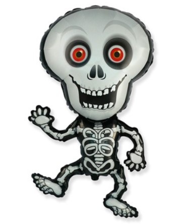 Фигурный шар из фольги с гелием в виде бело-черного танцующего и веселого скелета, размер фигуры 70х100 см без учета наполнения.