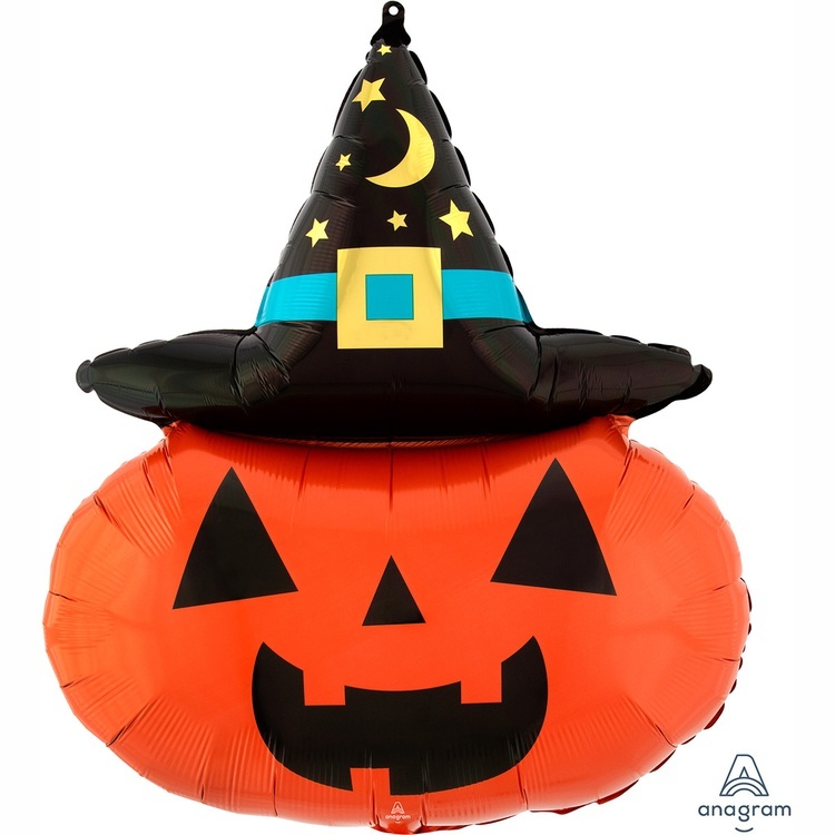 Фигурный шар из фольги с гелием в виде оранжевой тыквы со страшной улыбкой в шляпе ведьмы на Хэллоуин. Размер фигуры в ненаполненном виде 89 см.