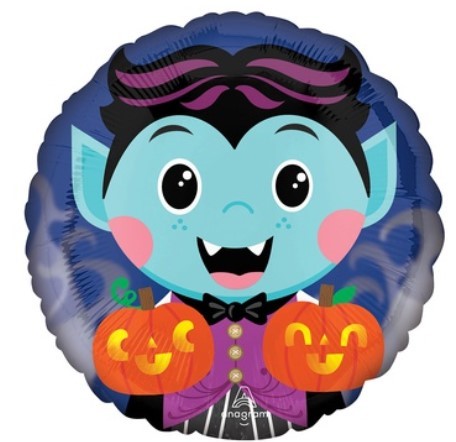 Фольгированная фигура с гелием в виде круга с изображением Вампира с тыквами на Хэллоуин. Размер круга 46 см без учета наполнения.