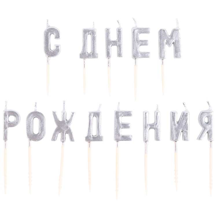 Декоративное украшение праздничного торта в виде свечей-букв "С Днём Рождения" на пиках серебряного цвета. Материал - стеарин. Высота буквы без пики, примерно 2,5 см. В наборе 13 букв.