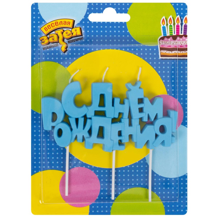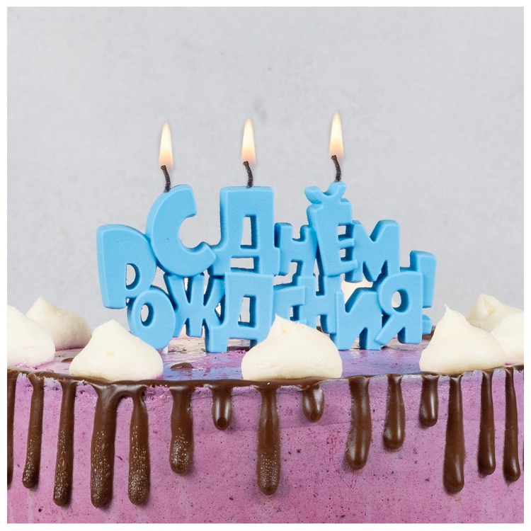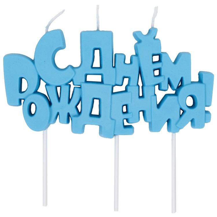 Декоративное украшение праздничного торта в виде свечи-таблички с буквами "С Днём Рождения" на пиках голубого цвета пастель. Материал - стеарин. Высота букв примерно 5 см, длина таблички примерно 10 см.