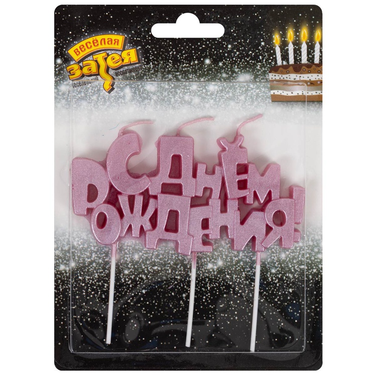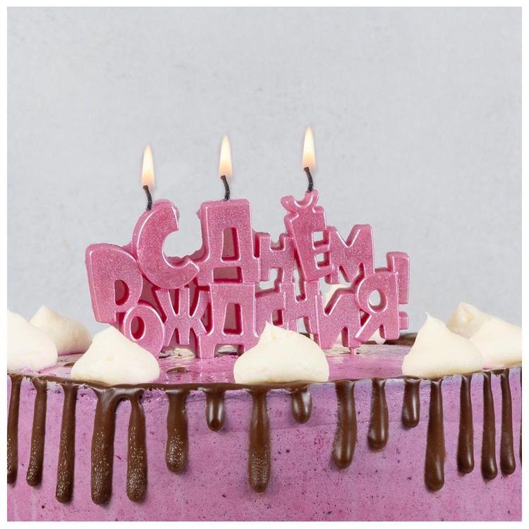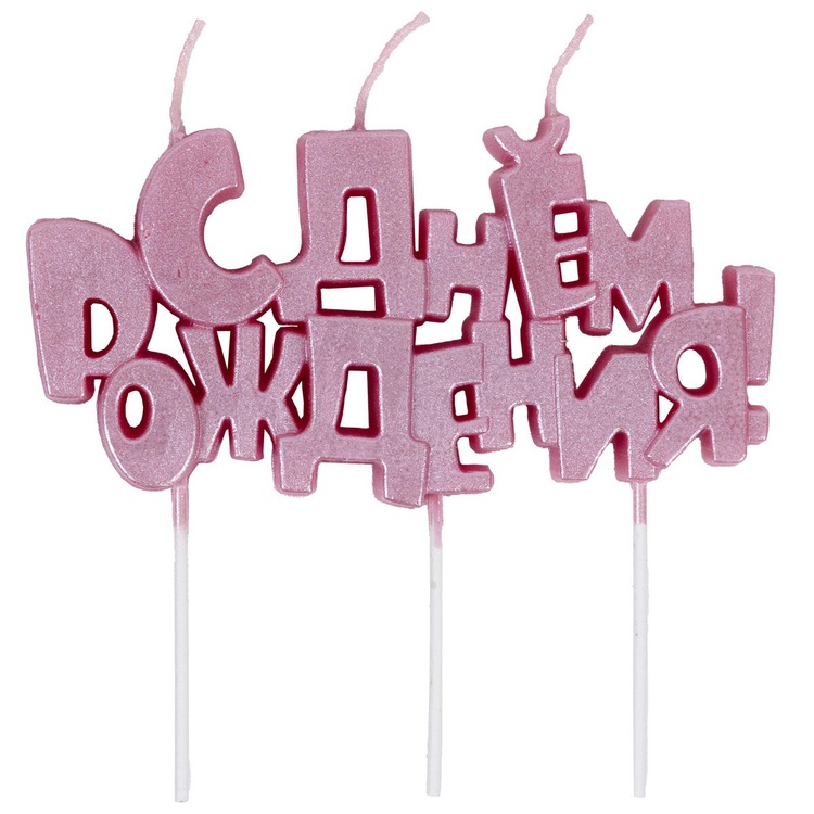 Декоративное украшение праздничного торта в виде свечи-таблички с буквами "С Днём Рождения" на пиках розового цвета с перламутровым блеском. Материал - стеарин. Высота букв примерно 5 см, длина таблички примерно 10 см.
