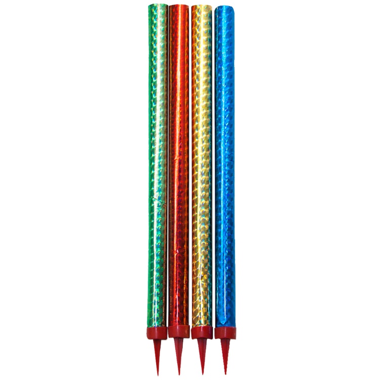 ПИРОТЕХНИЧЕСКИЕ свечи-фейерверки! В упаковке - 4 шт, длина - 25 см, подставка есть. Время горения - около 60 сек. Радиус опасной зону - 0,5 м. Для лиц старше 16 лет. Пламя - цветное.