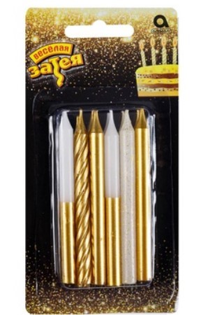 Красивый набор бело-золотых свечей в торт с разными дизайнами. Высота свечей 8 см, в упаковке 12 шт, без держателей.
