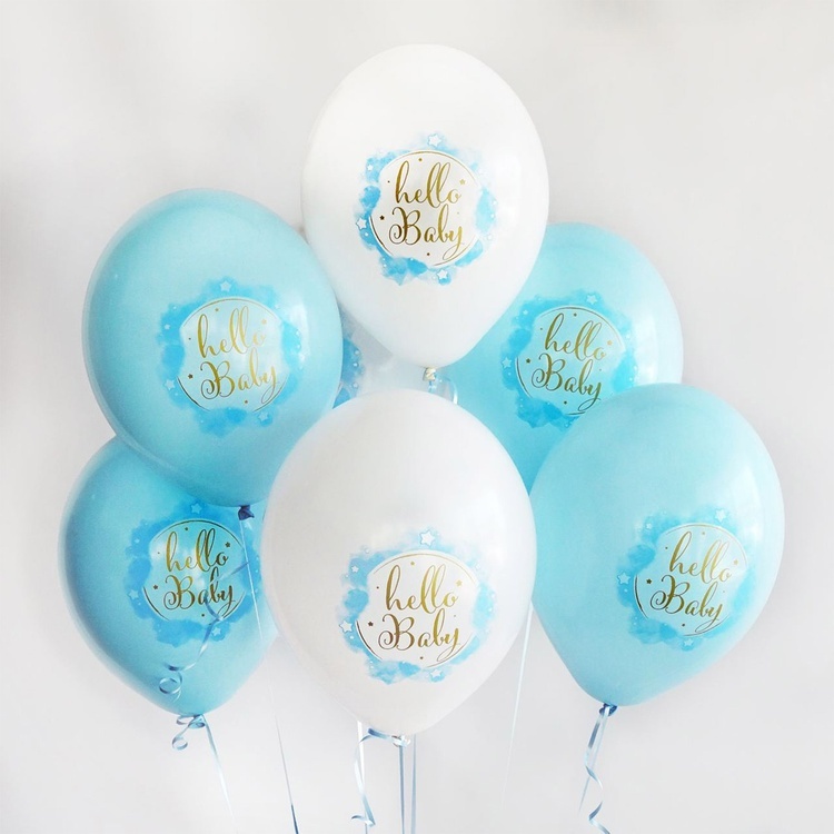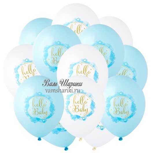 Шары из натурального латекса голубого и белого цвета с золотой надписью - Hello Baby на выписку из роддома мальчика. Размер шаров 35 см, наполнены гелием и обработаны специальным составом для длительного полета.