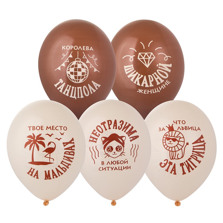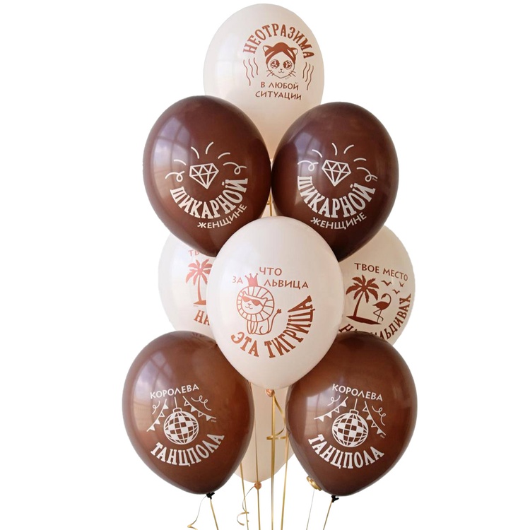 Гелиевые шары из натурального латекса в коричневом и бежевом цвете для подарка Шикарной Женщине, львице - Тигрице и другими юмористическими фразами. Размер 35 см, наполнены гелием и обработаны специальным составом для длительного полета.