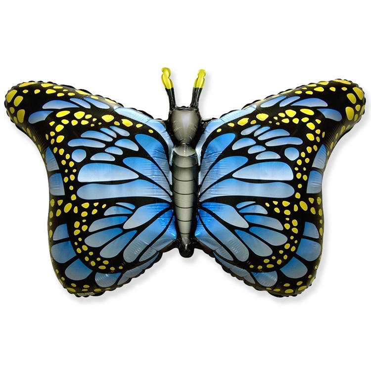 Фигурный шар из фольги с гелием в виде бабочки с синими крыльями. Размер фигуры без учета наполнения 56х97 см.