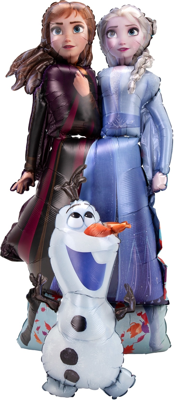 Новый большой ходячий шар из фольги в виде сестер Анны и Эльзы вместе со снеговичком Олафом из мультфильма "Холодное Сердце" 2 часть. Размер фигуры 68 х 147 см. Наполнена фигура гелием, но установлена на специальные грузики, поэтому к потолку не взлетает.