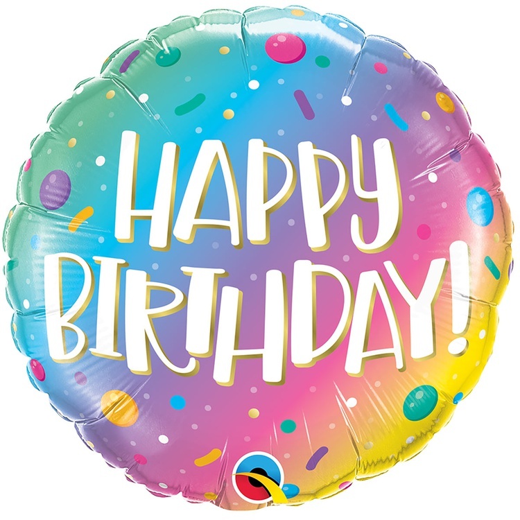 Фигурный шар из фольги с гелием в виду круга на День Рождения в нежных радужных цветах и рисунками конфетти. Размер фигуры без учета наполнения 46 см.