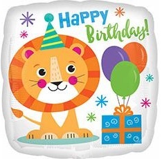 Фигурный шар из фольги с гелием в виде квадрата на деньрождения с нарисованным счастливым львенком. Размер фигуры 46 см.