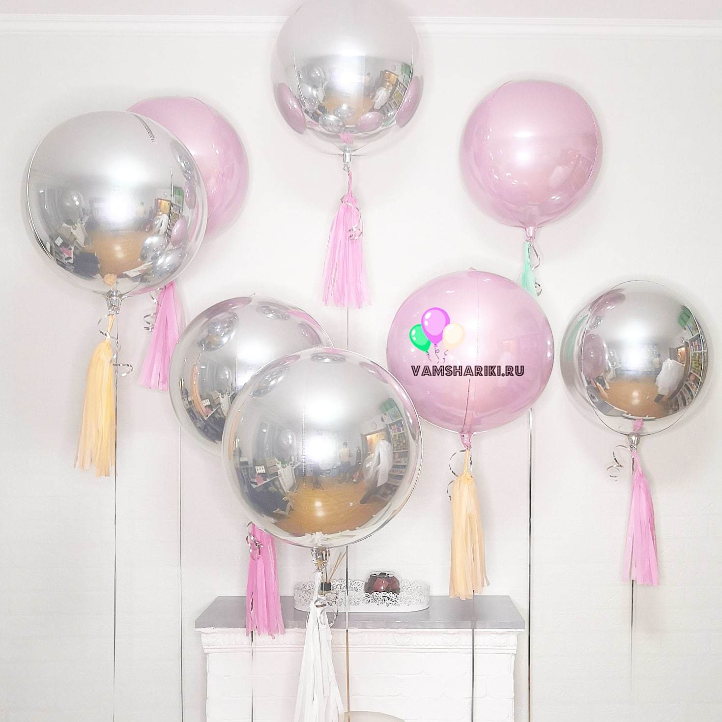 Абсолютно круглый фольгированный золотой 3D шар из 4 частей, с невидимыми швами, плотная эластичная пленка с металлизацией позволяет надувать шар до формы идеальной сферы без складок. Размер шара 38 см. Шар наполнен гелием и установлен на грузик. Цвет шара розовый пастель.