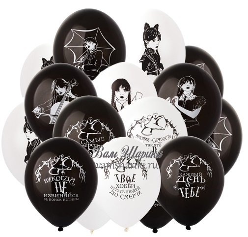 Черные и белые шары из натурального латекса с двухсторонними рисунками так же белого или черного цвета очень популярной героиней темных историй - "Уэнсдэй" (Wednesday). Прекрасный подарок для девочек от 5 лет и страше. Размер шаров 35 см, наполнены гелием и обработаны составом для длительного полета.
