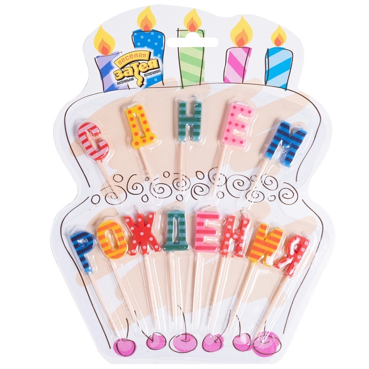 Свечи в торт на пиках в виде разноцветных букв из которых получается словосочетание "С Днём Рождения", размер без пики в среднем 2,5 см. В упаковке 13 букв-свечей.