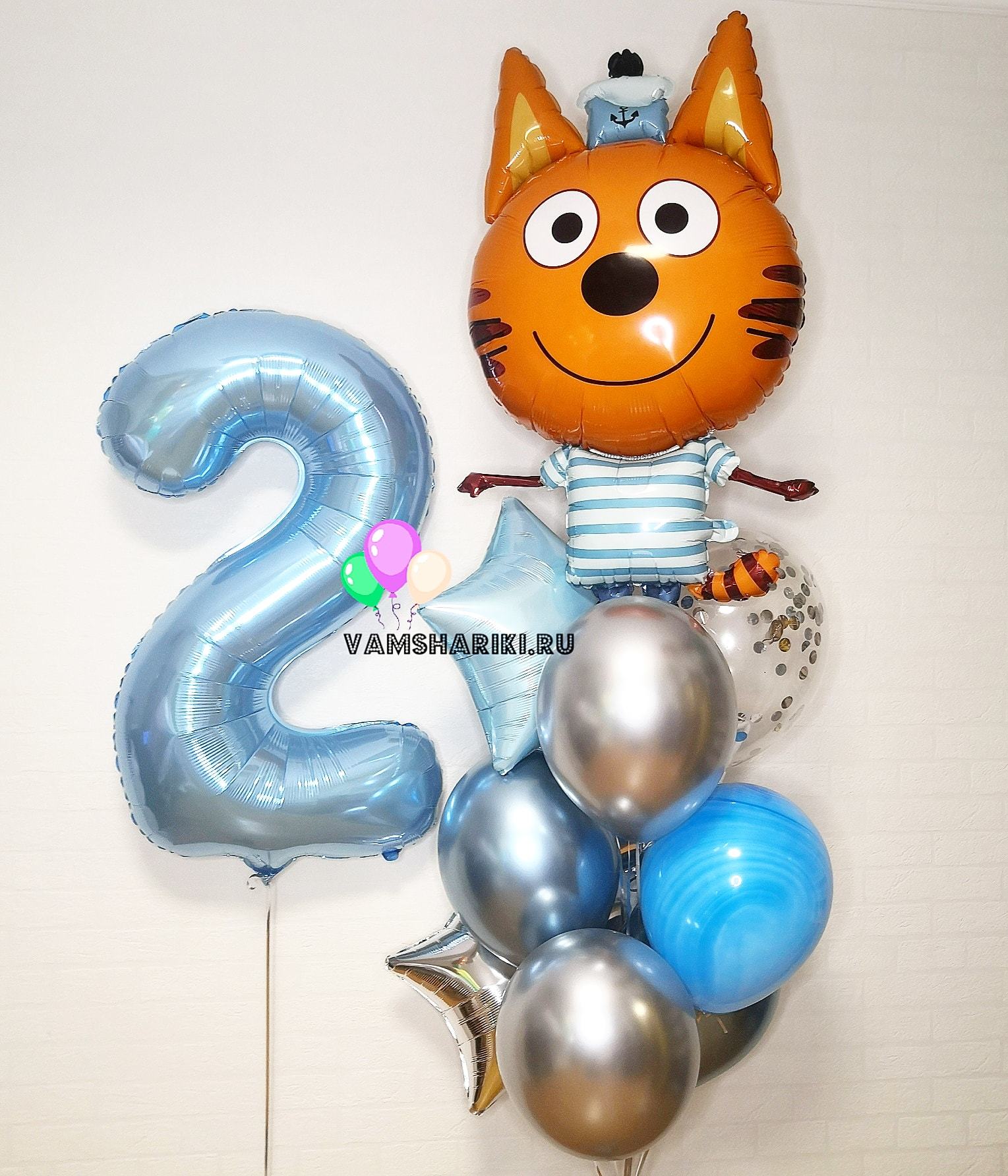 Фигурные шары из фольги в виде тонких (slim) больших цифр красивого цвета - голубой металлик, размер фигуры 102 см без учета наполнения. Шар наполнен гелием и установлен на грузик ручной работы.