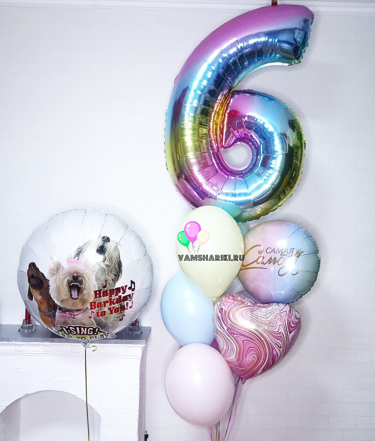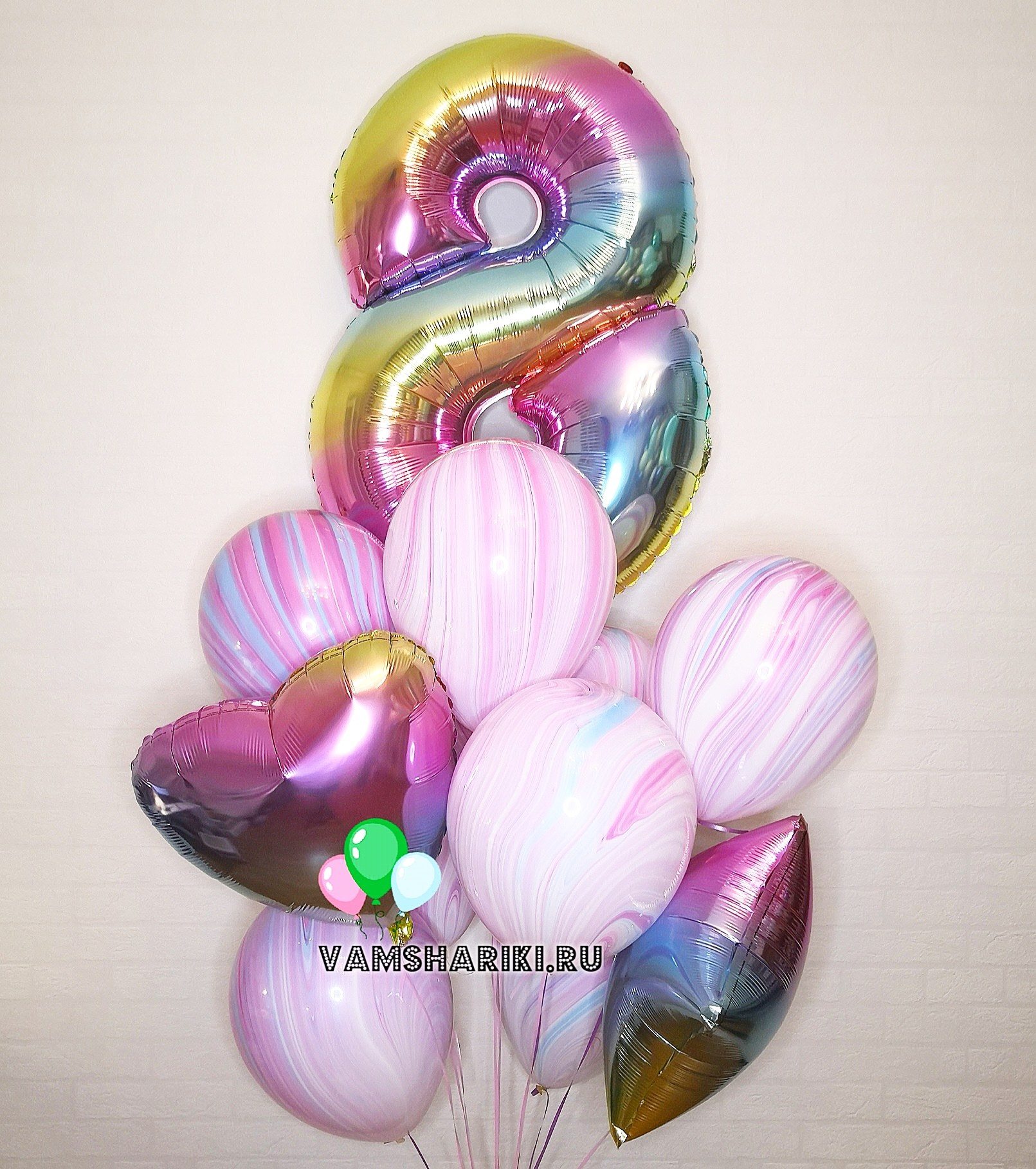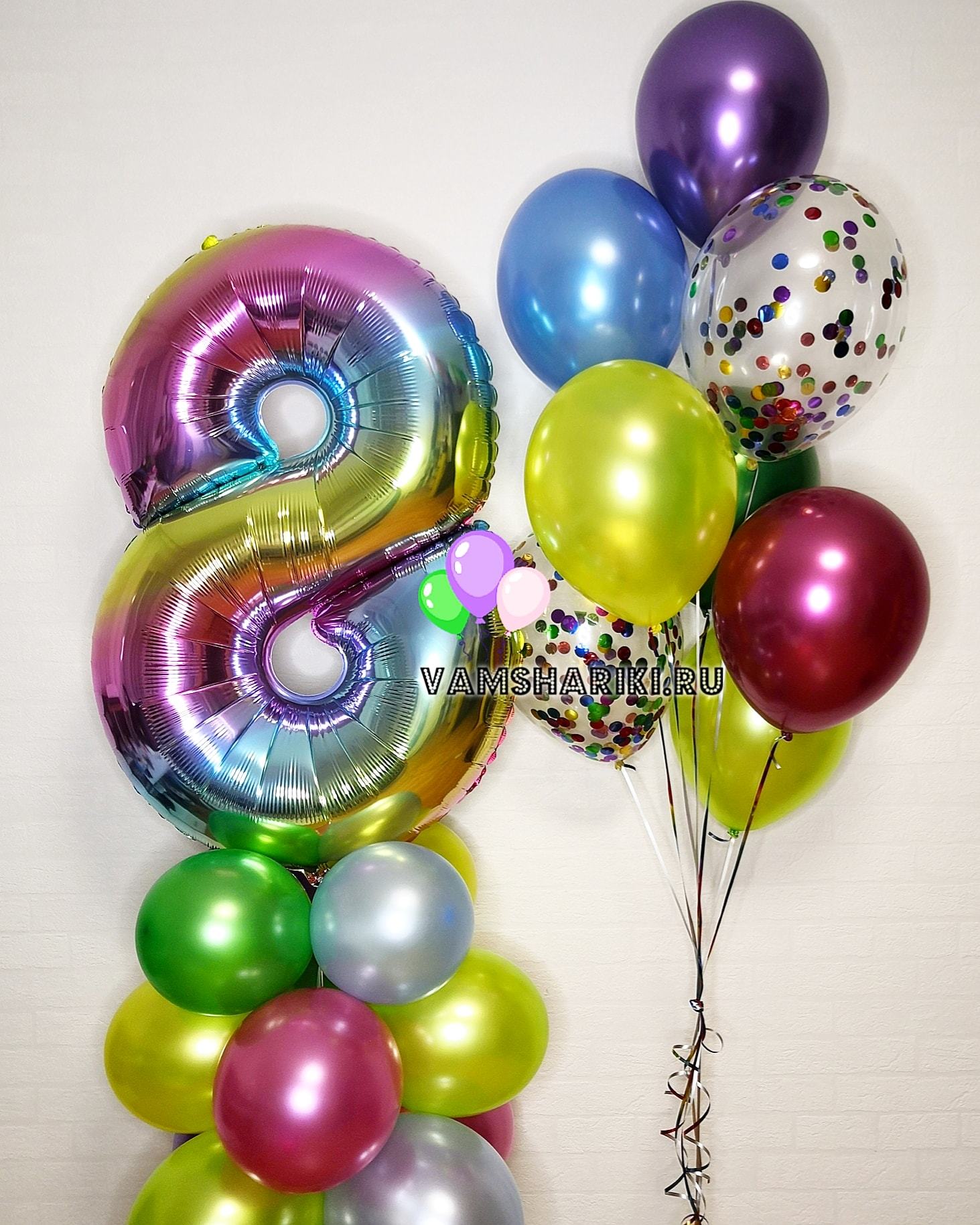Фигурные шары из фольги с гелием в виде больших метровых цифр, цвет который градиентом переходит от цвета к цвету. Идеальны для ярких праздников, для тех кто любит радугу! Размер фигуры 102 см, шар установлен на грузик.